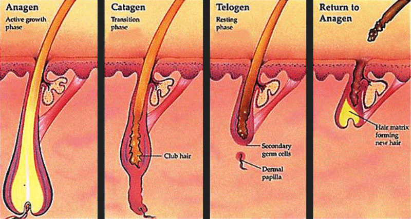 Die Haare durchlaufen fortlaufende Erneuerungsprozesse, die sich in drei Phasen unterteilen. Diese Phasen sind jedoch nicht synchron, daher befinden sich unterschiedliche Haare zur gleichen Zeit in unterschiedlichen Wachstumsphasen.